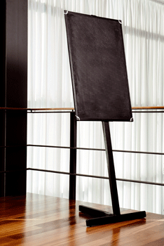 Atril portapóster de aluminio anodizado plata con sistema de marco abatible para sujetar el póster y que permite posición vertical u horizontal.